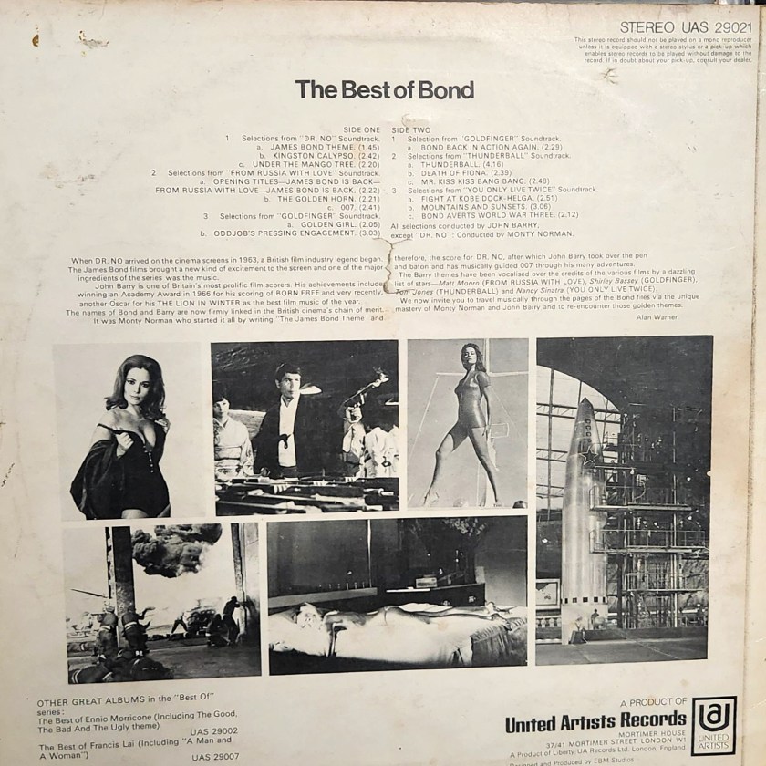 The record labels and spine both use a different title from what is on the compilation album cover, both written as “The Best Of Bond – Original Soundtracks.”