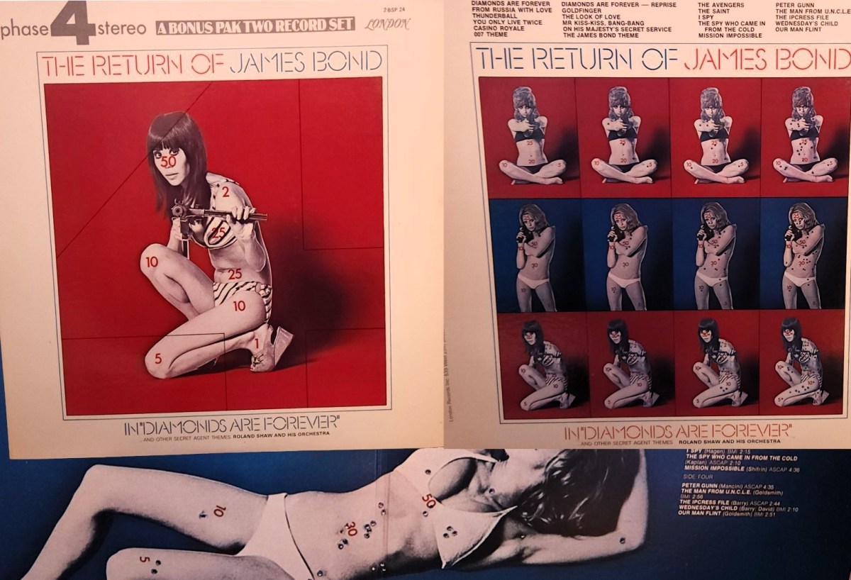 As Shaw had now recorded a solid decade of Bond music and other themes from the Spy Film genre, an entire second vinyl is filled with spy themes from I Spy, to The Ipcress File, to Our Man Flint. Also, the artwork is pretty unique for this album, so I thought I’d share the front, back, and gatefold displaying the curious choice of bikini-clad women on what looks to be shooting-range targets. 🤨