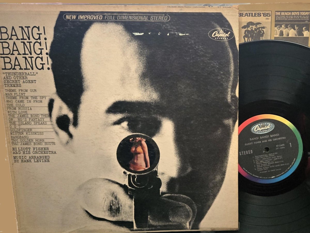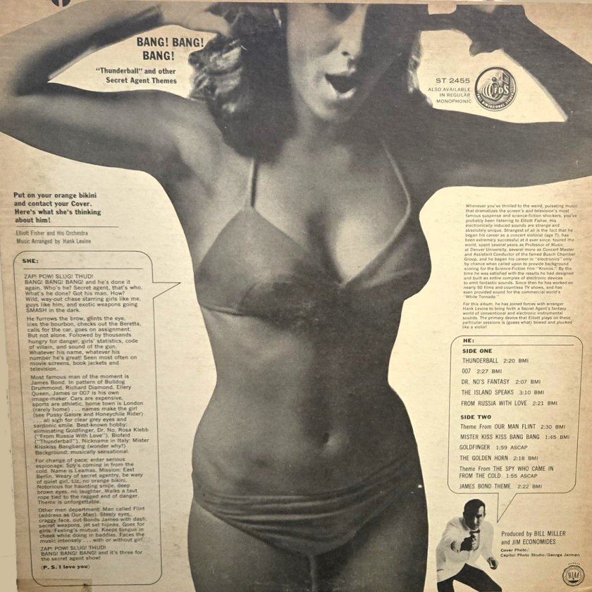 In 1957, after Fisher became a professor of music at Denver University, he was asked to create spooky sounds for a sci-fi/horror film, ‘Kronos’. As this was still years before the desired creepy sounds could be created on a Moog synthesizer, Fisher created the soundscape with his violin. This led to Fisher getting jobs creating more spooky sounds for film and television, where he played violin during recording sessions. Capitol Records then hired Fisher for this 1966 compilation album of exotica-sounding themes from the spy genre, Bang! Bang! Bang!’ Besides the theme to ‘Our Man Flint,’ the remaining ten tracks are from the first four James Bond films, including the Thunderball theme and Mister Kiss Kiss Bang Bang.