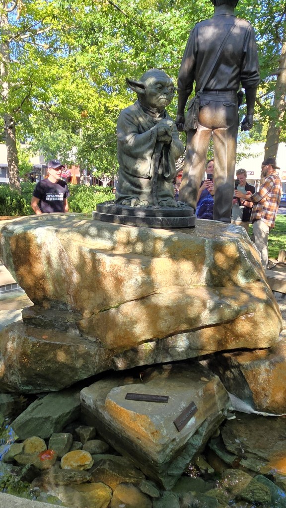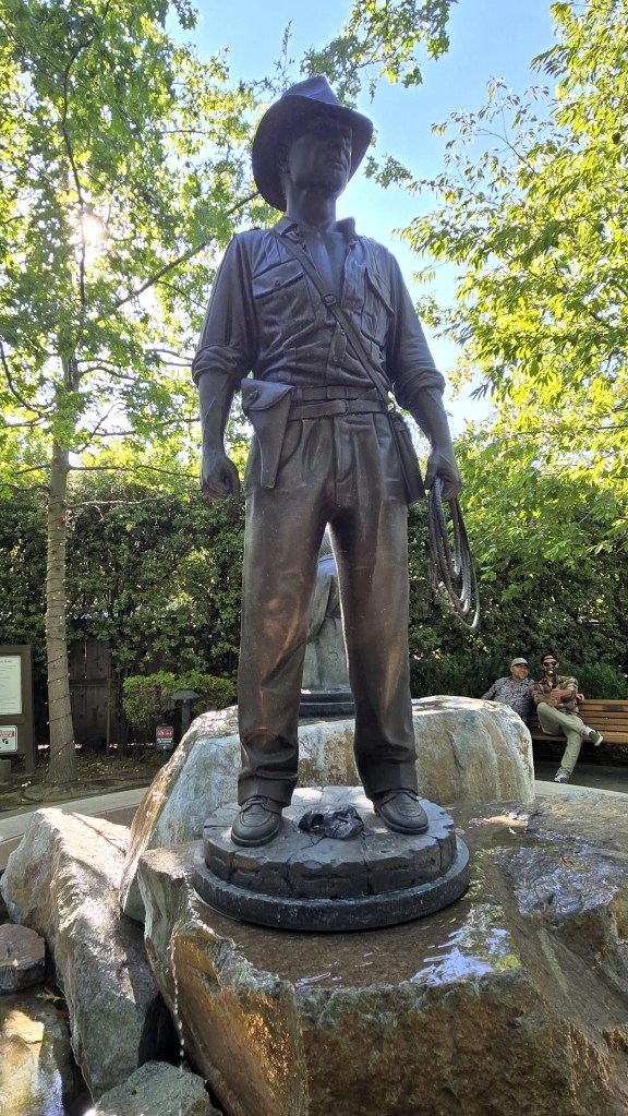 Marked, not just with small plaques, but with two life-size statues of Yoda and Indiana Jones found on top of a fountain at the far end of the park.