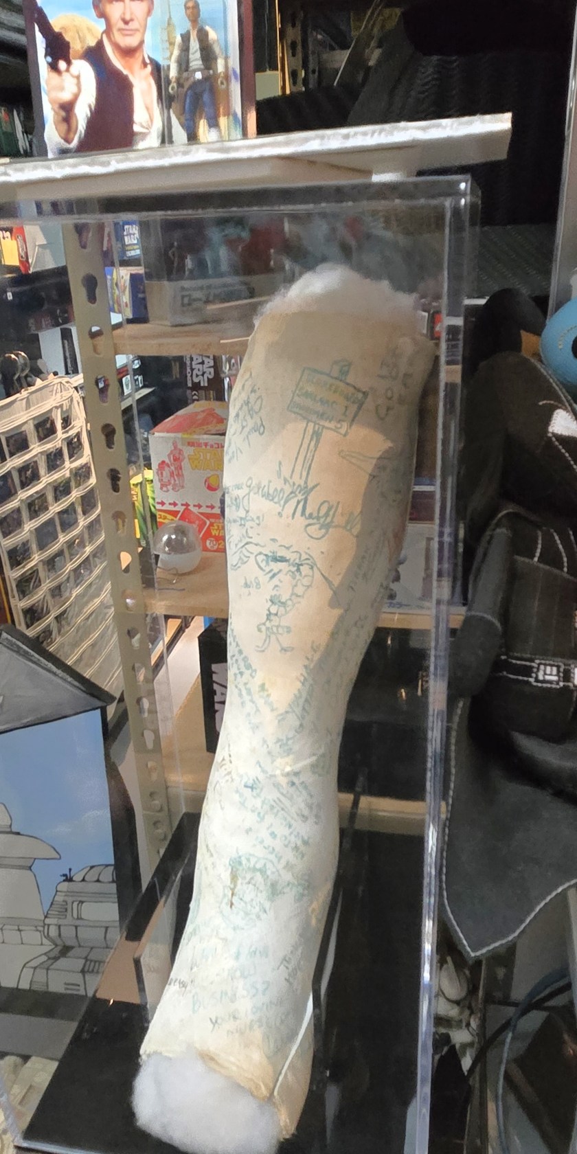I think this leg cast belonged to one of Harrison Ford’s stunt doubles on the set of Return of the Jedi. I’m not sure what happened or whether it was Vic Armstrong or Larry Holt, but many members of the ROTJ cast and crew signed it during filming.
