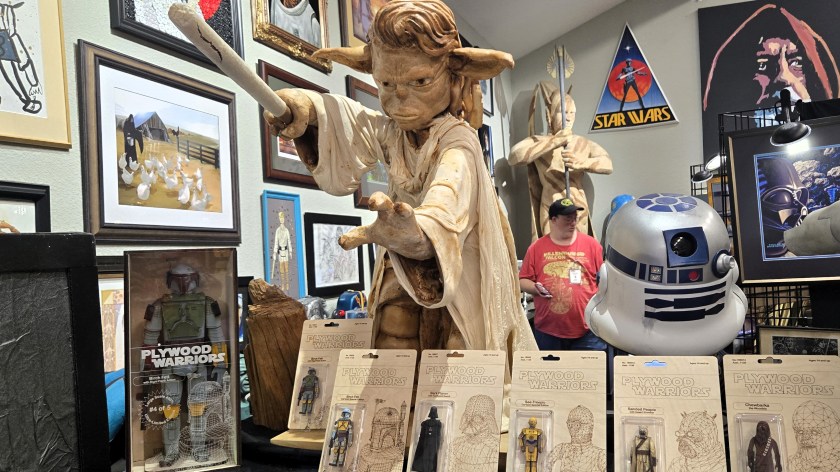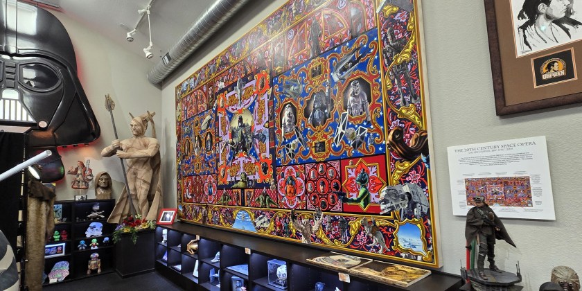 Standing 8 feet tall and stretching 15 feet long, this might be the world’s largest Star Wars oil painting. First shown at Star Wars Celebration 2015, it features many vintage Star Wars action figures and vehicles, and plenty of hidden details in its colorful, tapestry-style background.