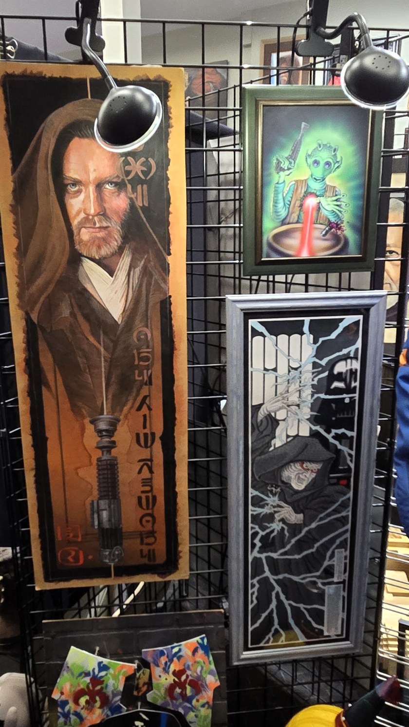I think that’s an original crewmember jacket from when they filmed The Empire Strikes Back, and it’s surrounded by some great art from both the prequels and the Original Trilogy.