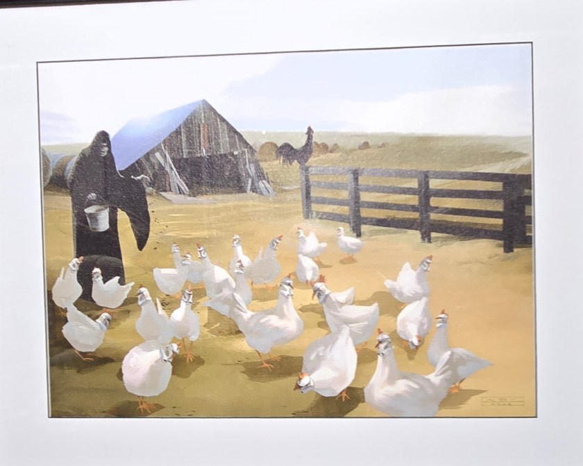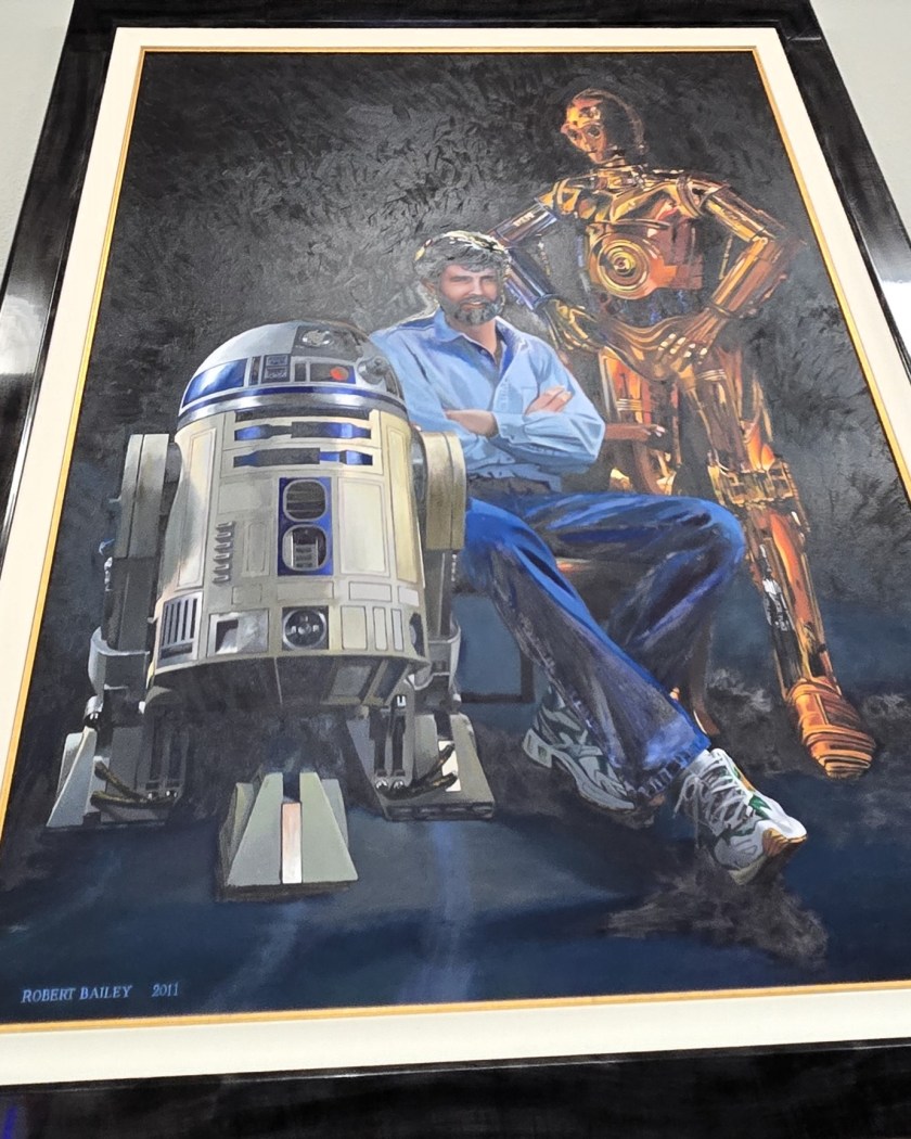 Who wouldn’t want an original hand-painted oil painting of Admiral Ackbar? I think this one was done by J Terrones, a Tijuana velvet artist. The other piece comes from when Lucasfilm moved its corporate departments, ILM, and LucasArts to the Presidio of San Francisco in 2005. It was inspired by Ralph McQuarrie’s artwork for a card that announced a similar move to North Hollywood in 1979.