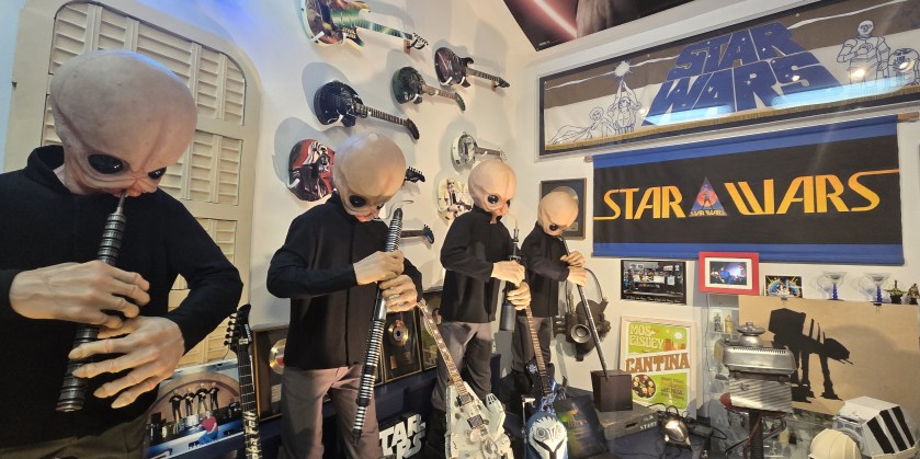 This first photo shows a fully pneumatic, musical Cantina Band animatronic from a store display. There’s also an original banner with an early logo and font used to promote the first film at San Diego Comic-Con in 1976.