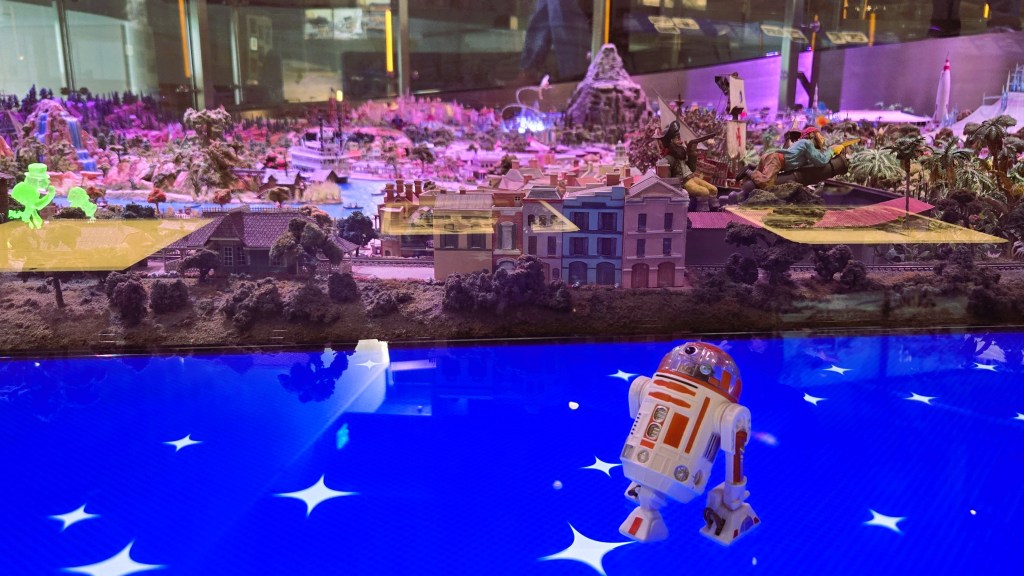One more shot of the Yoda Fountain with a well-placed C-3PO and Grogu in the window above.
